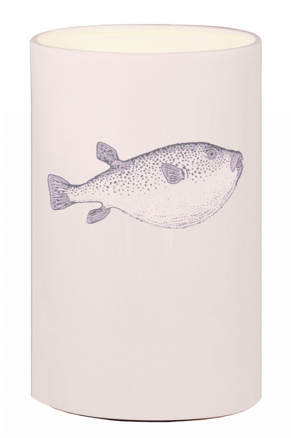 Pöytävalaisin, jossa kuvio. Valkoista mattapintaista keramiikkaa. Piirretty sudenkorento, kimalainen tai pallokala. Korkeus 25 cm. Leveys 15 cm. Syvyys 10 cm. Lampunpidike E27. Enintään 60 W.