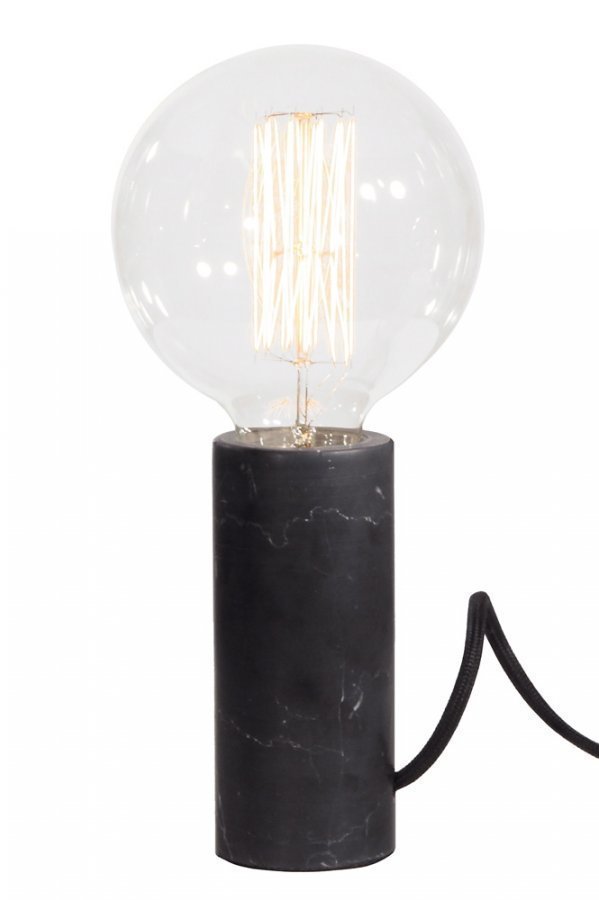 Pöytävalaisin, jonka sorvattu sylinterinmuotoinen jalka luonnonmarmoria. Musta kangaspäällysteinen johto, jossa katkaisin. Korkeus lampun kanssa 26 cm. Halkaisija 12 cm. Lampunpidike E27. Enintään 60 W, lamppu ei mukana.