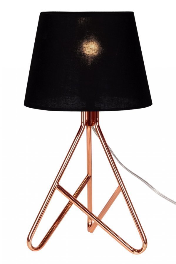 Sway-pöytävalaisin kuparinväristä metallia. Pehmeästi pyöristetyt jalat ja musta puuvillavarjostin. Läpikuultava johto, jossa katkaisin.Korkeus 40 cm. Halkaisija 21 cm. Lampunkanta E14. Enintään 40 W. Tess Palm.