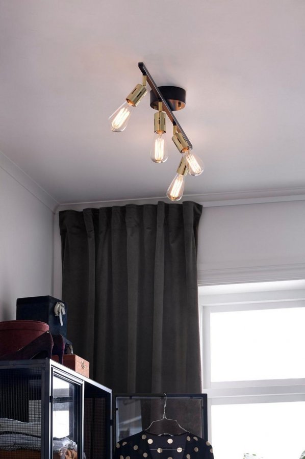 Metallinen plafondi, jossa 4 säädettävää lamppua. Pituus 90,5 cm, korkeus 19,5 cm. Kattokuppi Ø 13 cm. 4xE27. Enintään 40 W. Valonlähteet eivät mukana.