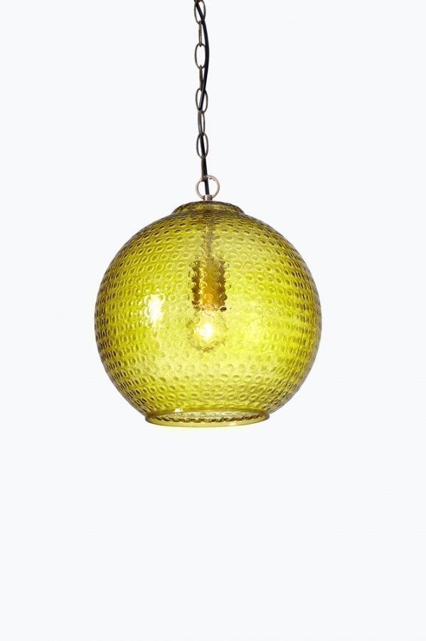 Kattovalaisin lasia, jossa kuplamainen kuvio. ø 30 cm. Ripustusketju, pituus 70 cm. Kattopistoke. Iso lampunkanta.