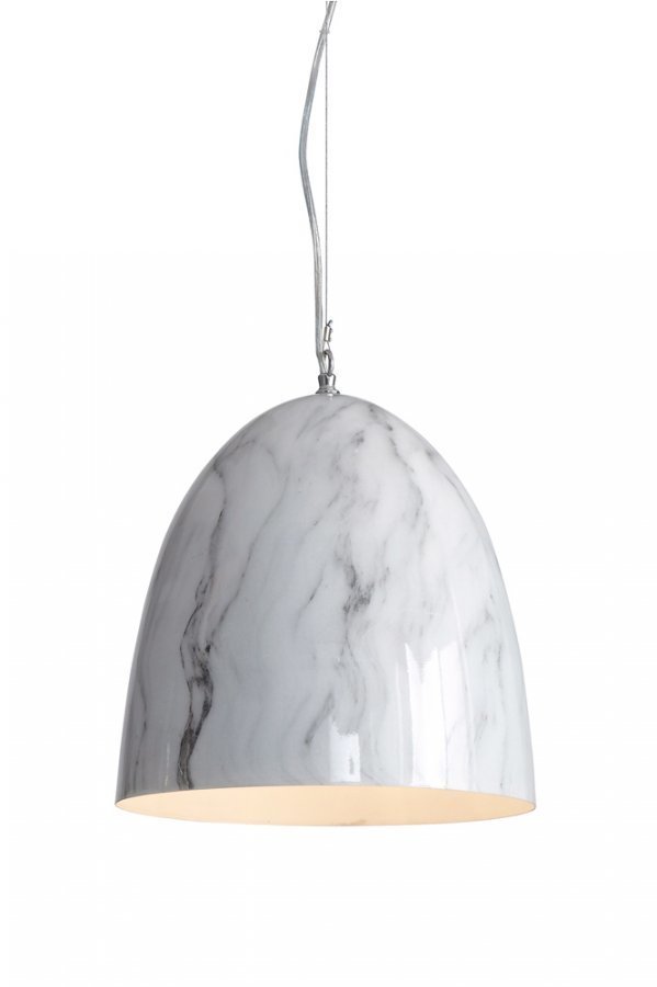 Kattovalaisin valkoista marmorikuvioitua metallia. ø 30 cm. Korkeus 31 cm. Vaijeri metallia, pituus 90 cm, ja läpikuultava johto, Johdon pituus 1 m. Kattopistoke. Iso lampunkanta.