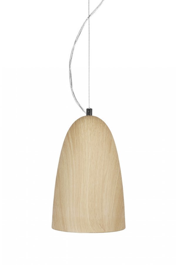 Wood Mini -ikkunavalaisin metallia, jossa painettu tammikuvio. Detaljit kromia. Vaijeri ja läpikuultava johto. Halkaisija 16 cm, korkeus 27 cm. Lampunpidike E27. Enintään 40 W. Design: Anna Andersson. Valonlähde ei ole mukana.