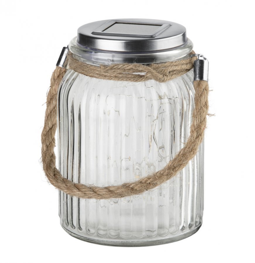 Nyt voit kirjaimellisesti pistää päivän purkkiin! Tämä koristevalaisin latautuu päivänvalossa ja antaa lämpimänvalkoista valoa 15 LED-valollaan. Virtalähteenä on AA-kokoinen 200 mAh:n akku, joka latautuu aurinkokennon avulla. Täyteen ladattu akku antaa jopa 8 tuntia valaisuaikaa. Pimeän tullen valaisimen hämäräkytkin sytyttää valon automaattisesti. Mitat (&Oslash x k) 11 x 15,5 cm.