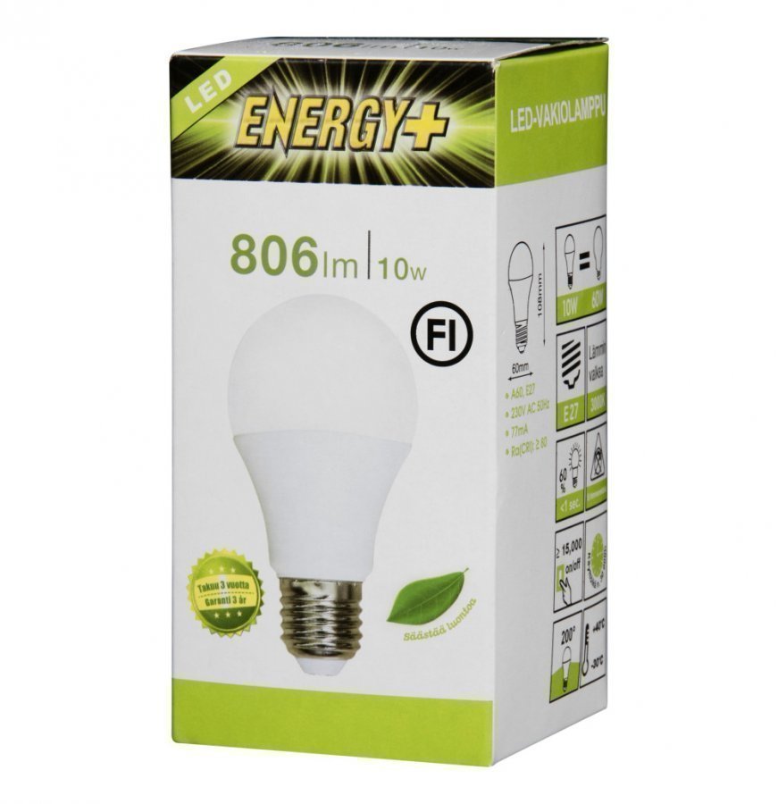 Luontoa säästävä ENERGY+ LED-Vakiolamppu kodin eri käyttötarpeisiin. Teho 10 W, kanta E27. Lämmin valkea valo, 806 lumen, 3000 K. Lämpötilan sieto +40°C ~ -30°C. Takuuaika jopa 3 vuotta. Ominaisuudet: – 10 W- E 27- 230 V- 806 lm- 3000 K