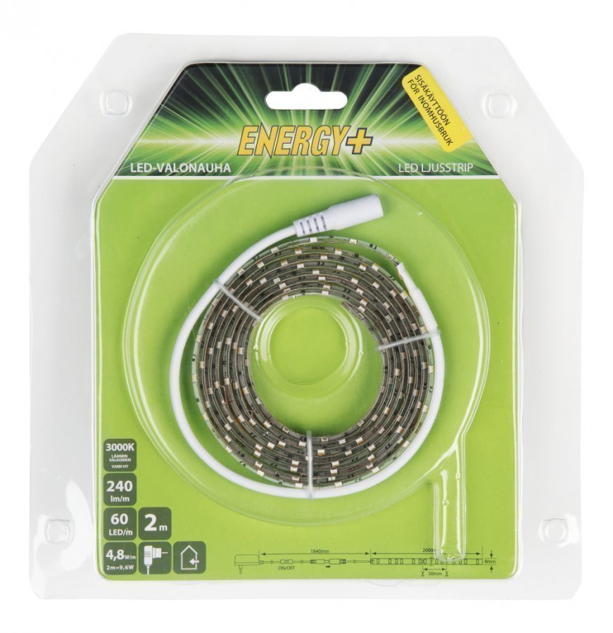 Sisäkäyttöön tarkoitettu Energy+ LED-valonauha on helppo asentaa tarrakiinnityksen avulla. Lämmin valkoinen valo. ON/OFF-kytkin. Valonauhan pituus 2 metriä. – 4,8 W- 240 lm- 60 LED-