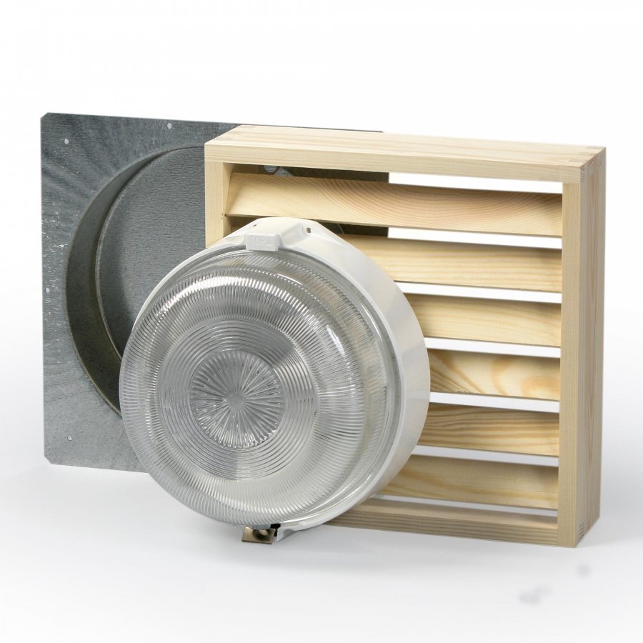 Valaisin upotettava-asennus mäntyritilällä. Valaisin on suunniteltu erityisesti saunoihin, mutta soveltuu myös muualle, missä tarvitaan kestävää perusvalaisinta. Runko lämmönkestävää polyesteriä, kupu lasia, heijastin alumiinia. Asennus seinälle, vähintään 100 mm etäisyydelle katosta – Ei kattoon! Tekniset tiedot: 1x60W A60/E27 IP44, ta125 °C