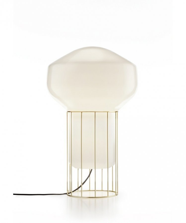 Design: Guillaume Delvigne for Fabbian. Konsepti: Tämän kokoelman takana on lahjakas nuori suunnittelija Guillaume Delvigne. Kokoelmaan kuuluu koristeellisia kiiltävästä, valkoisesta, käsin puhalletusta lasista valmistettuja valaisimia. Delvigne halusi luoda kohteen, joka on ilmaakin kevyempi. Valaisin, joka on niin kevyt, että se nousee itsekseen. Vaikka pöytä- ja lattiavalaisimissa on metallinen häkkiä muistuttava jalusta, valaisin antaa silti halutun kevyen vaikutelman. Valaisinten eleganssi ja yksinkertaisuus tekevät niistä erittäin hyvin soveltuvia mihin tahansa kotiin. Valaisimien keveys tarjoaa entistäkin enemmän mahdollisuuksia niiden käyttöön ja sijoitteluun.