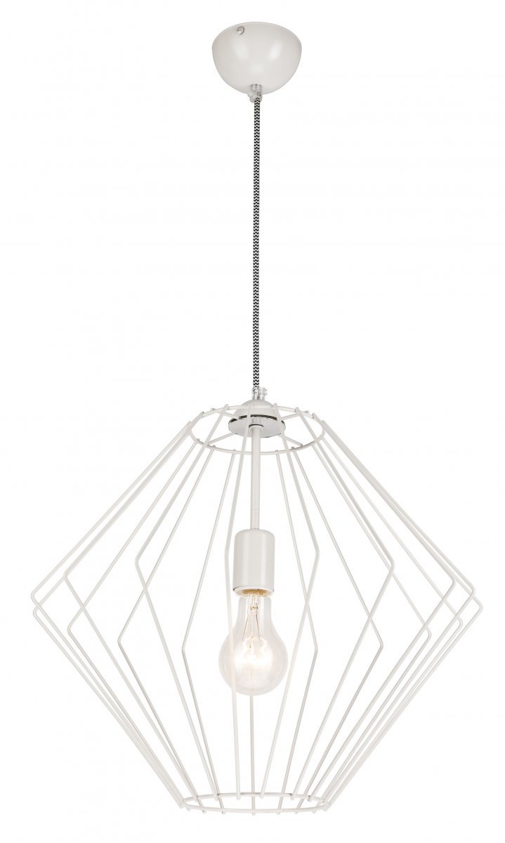 Tunnelmallista valoa heijastava kattovalaisin. Viimeisteltyä tyylikkyyttä tuo kangaspäällysteinen ripustusjohto. Metalliosa maalattu valkoiseksi. Halkasija 45 cm. Korkeus 150 cm.