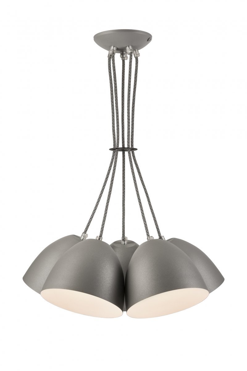 5-haaraisessa Livia-kattovalaisimessa on harmaat metallikuvut ja mustavakoiset kangasjohdot.