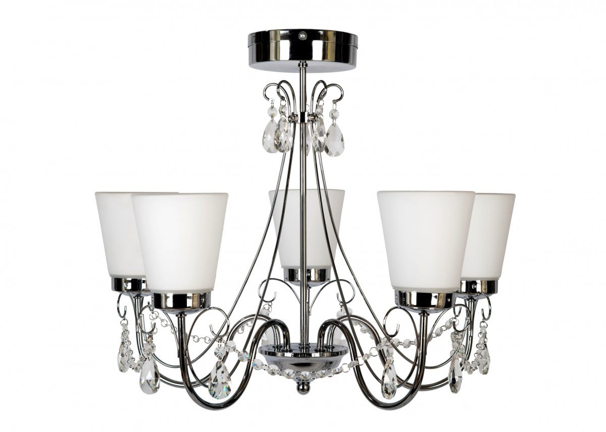 Loistokas krominen kattovalaisin. Kiiltävän rungon lisäksi loiston kruunaa K9-kristallit. Tämä valaisimen voi asentaa myös kosteisiin tiloihin, koska valaisimen suojausluokka on IP44. Halkaisija 60 cm, korkeus 50 cm. Kiinteä asennus. Valoteho 5xE14.