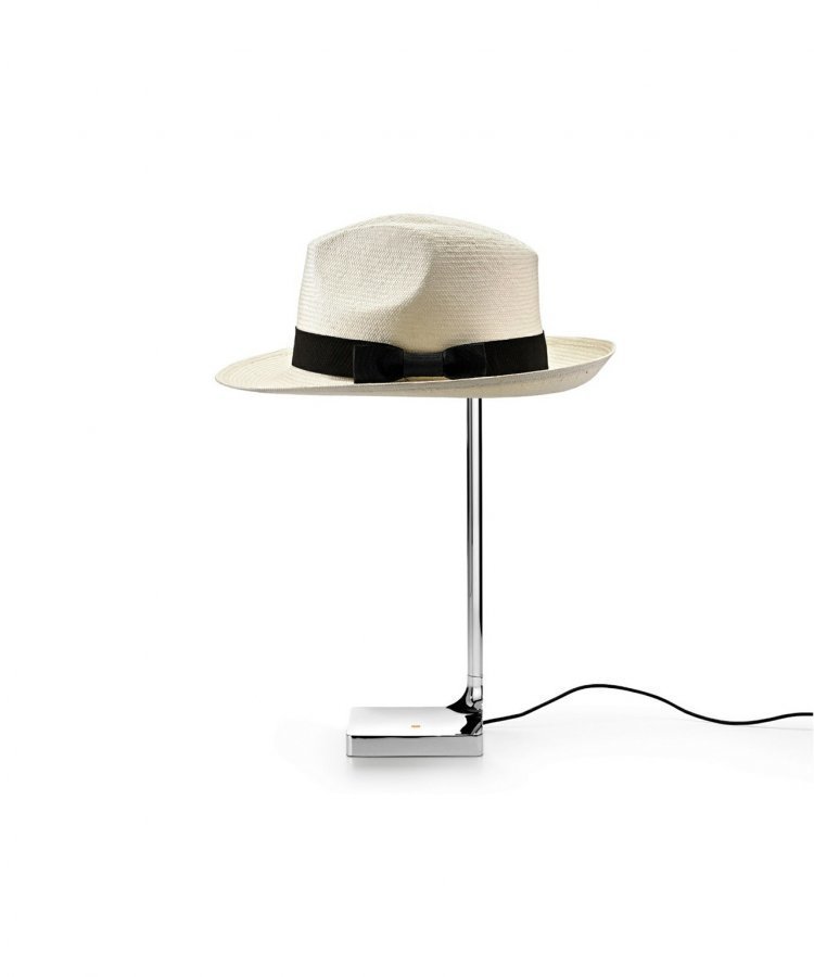Design: Philippe Starck for Flos. Konsepti: Chapo LED-pöytävalaisin on elegantti ja eläväinen yhdistelmä valaistusta, hattutelinettä ja latausasemaa. Valaisimen runko koostuu kromatusta metallista, mikä luo elegantin kontrastin valitsemallesi hatulle. Tuotteeseen sisältyy kevyt Trilby-hattu, mutta ajatus on, että korvaat sen kulloisiakin tuntemuksiasi kuvastavalla hatulla, oli se sitten lempilippiksesi, isoisän keilaushattu tai uuden vuoden aaton pilailupäähine. Tämän lisäksi Chapo -pöytävalaisin toimii myös latausasemana suurimmalle osalle älypuhelimia ja tabletteja. Latausjohdot (enintään 1.5A) sopivat valaisimen jalustassa olevaan USB-porttiin.