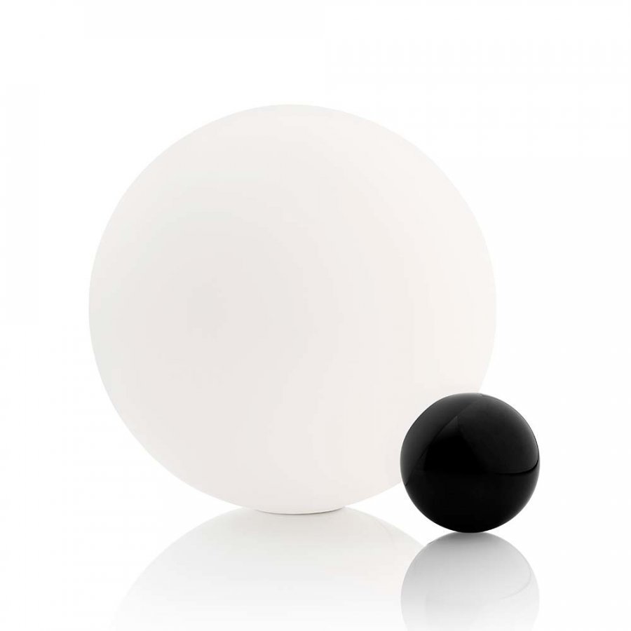 Kaksi sfääriä, jotka koskettavat toisiaan. Yksi pieni jalometallinen, joka on asennettu suuren valaistetusta laisista valmistetun varjon alle. M. Anastassiades. 1 COB LED 2700K 1380lm yhteensä CRI83 – 16W.
