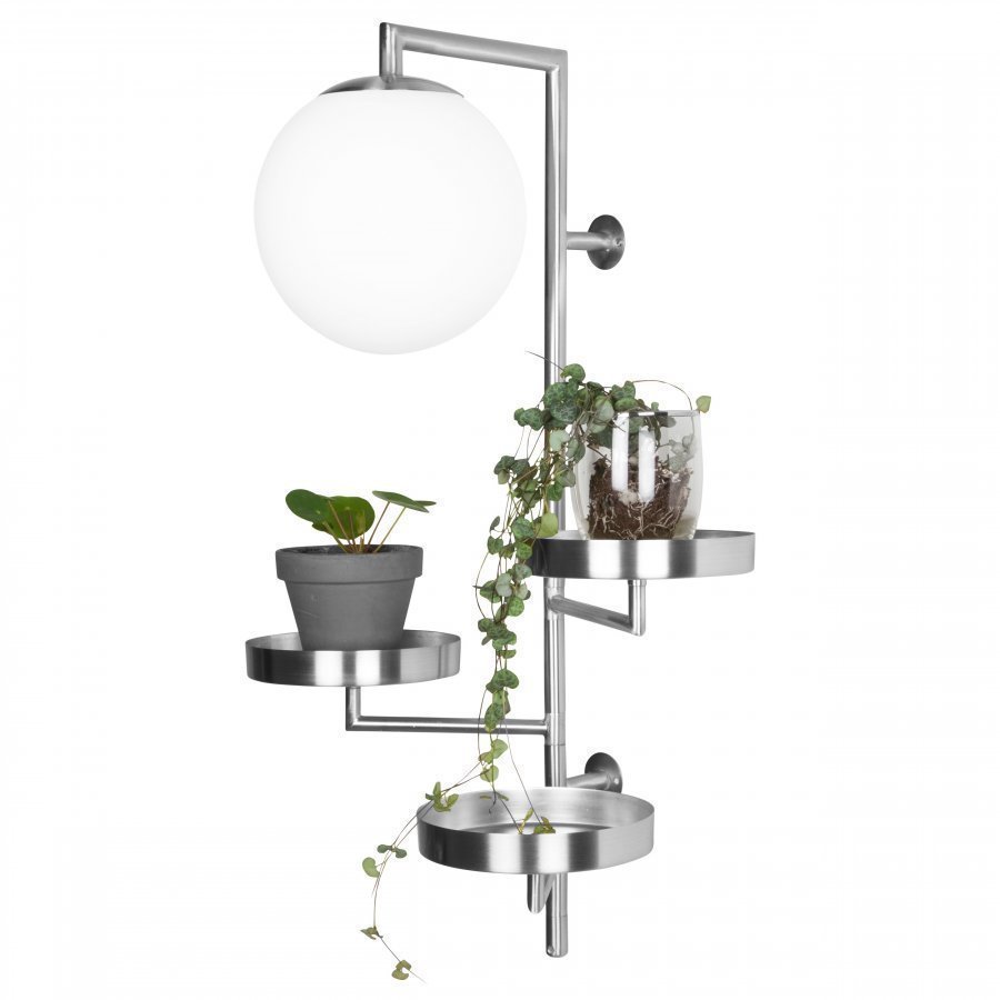 Globen Lightingin seinävalaisin. Valaisin voitti Hus & Hem -lehden suunnittelukilpailun vuonna 2016. Seinävalaisimessa on opaalilasikupuisen lampun lisäksi kolme jalustaa haluamillesi koristeille. Valkoinen tekstiilijohto, jossa on katkaisija.