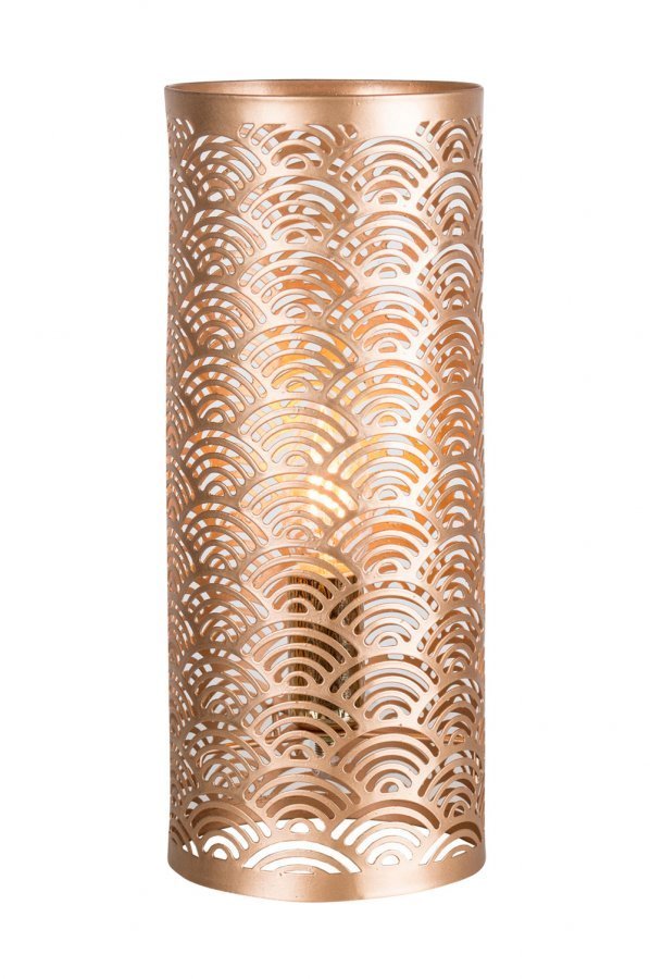 Metallinen pöytävalaisin, jossa hienostunut kaarikuvio art deco -tyyliä. Korkeus 30 cm, Ø 12 cm. Lampunkanta E14. Enintään 40 W. 2 metrin läpikuultava johto, jossa katkaisin.