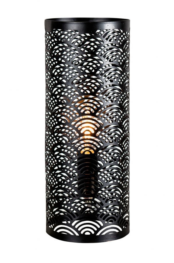 Metallinen pöytävalaisin, jossa hienostunut kaarikuvio art deco -tyyliä. Korkeus 30 cm, Ø 12 cm. Lampunkanta E14. Enintään 40 W. 2 metrin läpikuultava johto, jossa katkaisin.