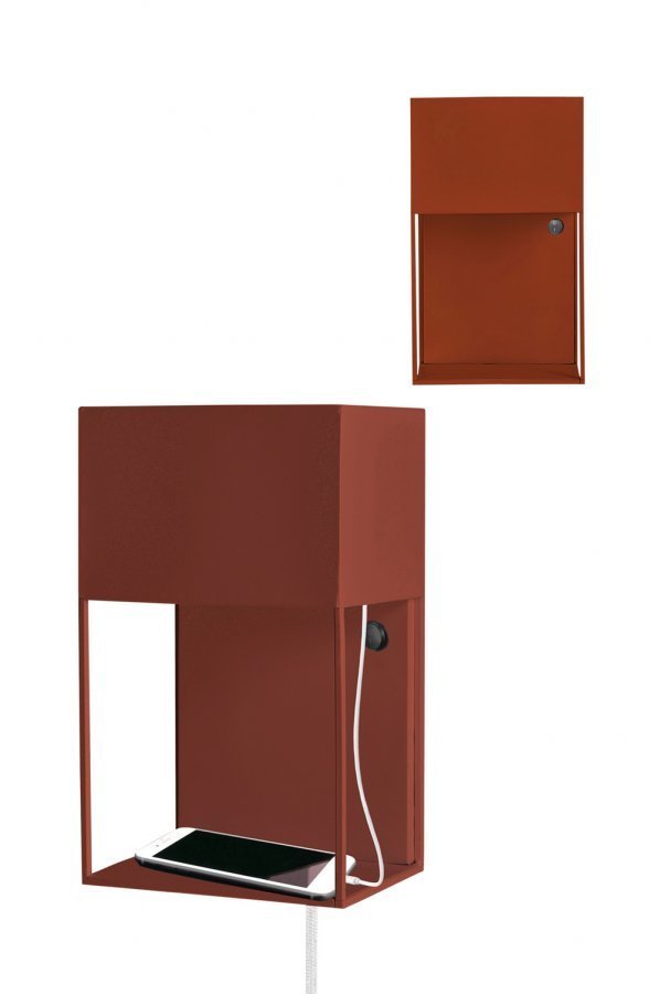 Seinävalaisin ruosteenpunaiseksi maalattua metallia. Hyllylevy. Sopii hyvin sängyn viereen. Voidaan sekä ripustaa seinälle että asettaa pöydälle. Varustettu USB-liitännällä puhelinta varten. Valkoinen kangaspäällysteinen johto, seinäpistoke, sekä katkaisin seinälevyssä. Korkeus 30 cm, leveys 18 cm, etäisyys seinästä 13 cm. Lampunpidike: E14, enintään 40 W.