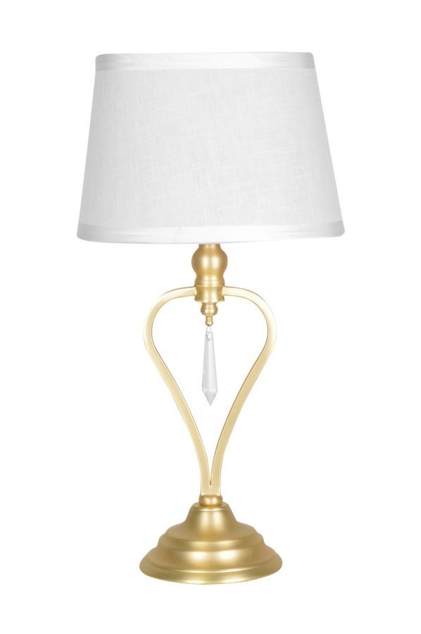 Pöytävalaisin, jonka jalassa harjatusta messingistä/metallista muotoiltu sydän ja riippuva kristalliprisma. Soikea varjostin puuvillaa. Korkeus 40 cm, leveys 22 cm, syvyys 15 cm. Lampunkanta E14. Enintään 40 W. 2 metrin läpikuultava johto, jossa virtakytkin.