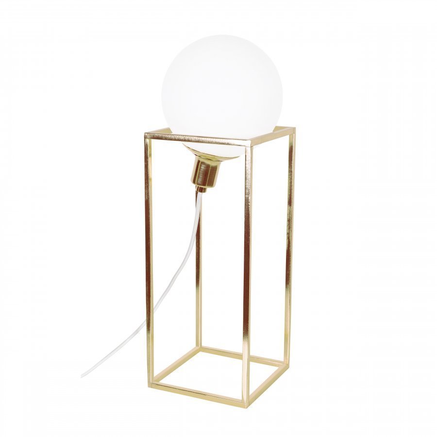 Moderni korkeampi messinkinen pöytävalaisin Globen Lightingilta. Tyylikäs kulmikkaan ja pyöreän muodon yhdistelmä ja valaisin joka sopii moniin tyyleihin ja tiloihin. Suunnittelija: Patrik Hall. Tukeva runko messinginväristä neliöputkea ja kupu mattalasia. Valkoinen tekstiilijohto valkoisella katkaisijalla sisältyy. Johdon pituus 2 metriä. Kanta E14. Max 40 W. Saatavissa ainoastaan verkkokaupastamme.