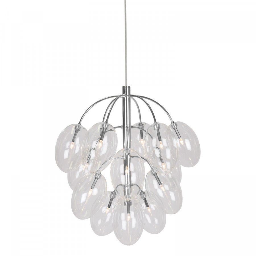 Drops riippuvalaisin kromista, 15 koristeellisella kuvulla kirkkaasta lasista. Johto on läpinäkyvä, sisäänrakennetulla muuntajalla kattokuvussa. Koukkuripustus.