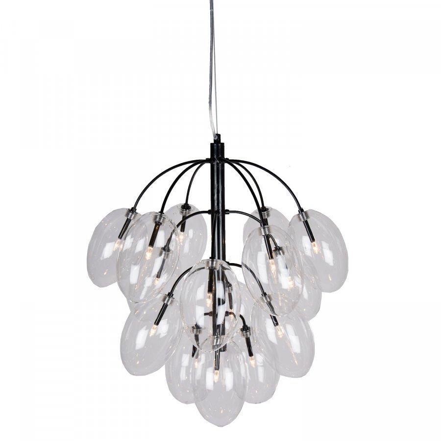 Drops riippuvalaisin mattamustasta metallista, 15 koristeellisella kuvulla kirkkaasta lasista. Johto on läpinäkyvä, sisäänrakennetulla muuntajalla kattokuvussa. Koukkuripustus.