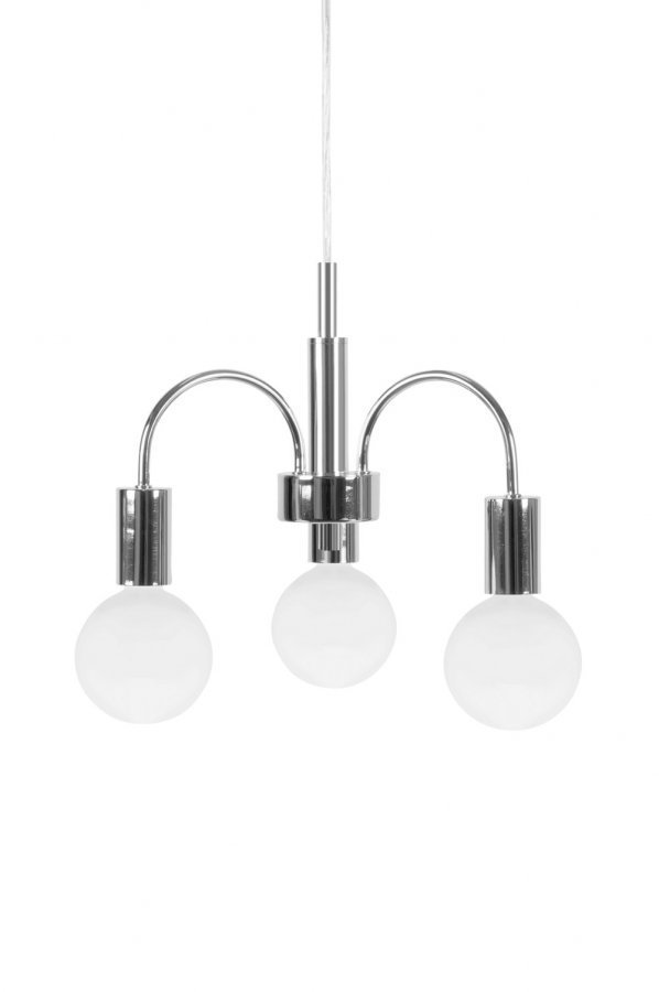 Krominvärinen 3-haarainen kattovalaisin. Läpikuultava johto. Halkaisija 30 cm, korkeus 21 cm. Lampunpidike 3xE27. Enintään 60 W. Valonlähteet eivät mukana. Kuvan valkoiset lasikuulat ovat opaalilamppuja, jotka tulee ostaa erikseen.