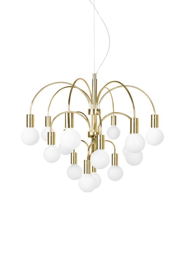Suurehko 16-haarainen kattovalaisin messinkiä. Alaspäin suunnatut valonlähteet. 3 m:n läpikuultava johto ja vaijeri. Halkaisija 80 cm, korkeus 60 cm. Lampunpidike 16 x E27. Enintään 40 W. Valonlähteet eivät mukana. Kuvan valkoiset lasikuulat ovat opaalilamppuja, jotka tulee ostaa erikseen.