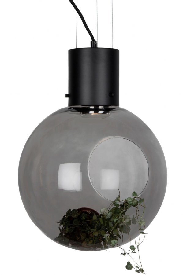Hole XL -kattovalaisin. Lasipallossa viisto aukko. Pallon sisään voi laittaa koristeita. Detaljit mattamustaa tai harjattua terästä. Musta kangaspäällysteinen johto ja vaijerit. Korkeus 40 cm. Halkaisija 30 cm. Lampunpidike E27. Enintään 60 W. Lamppu ei mukana. Design: Tess Palm.