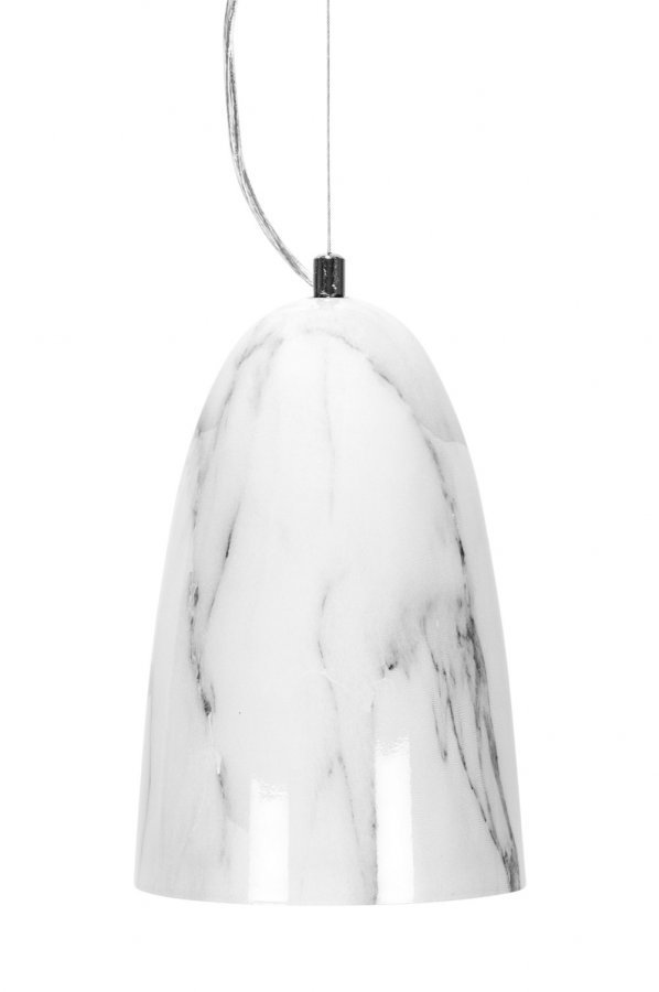 Marriot-kattovalaisin valkoista marmorikoristeista metallia. Krominväriset detaljit. Vaijeri ja läpikuultava johto. Halkaisija 12 cm. Korkeus 20 cm. Lampunkanta E27. Enintään 60 W. Design: Anna Andersson.