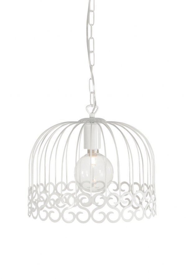 Kattovalaisin valkoiseksi maalattua metallia. Stanssattu kuvio. Koristeellinen, valkoinen ketju ja läpikuultava johto. Halkaisija 32 cm. Korkeus 28 cm. Lampunkanta E27. Enintään 60 W.