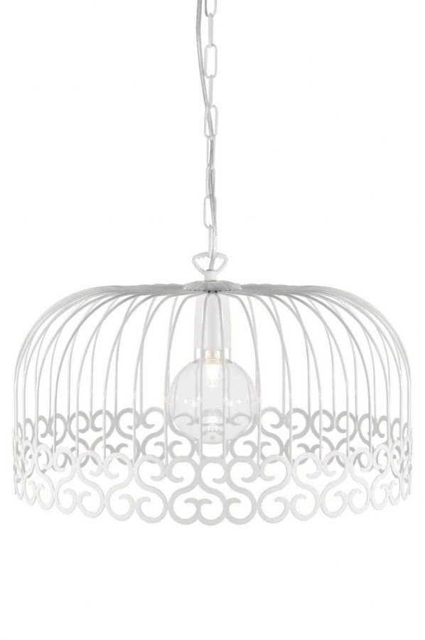 Kattovalaisin valkoiseksi maalattua metallia. Stanssattu kuvio. Koristeellinen, valkoinen ketju ja läpikuultava johto. Halkaisija 45 cm. Korkeus 28 cm. Lampunkanta E27. Enintään 60 W.
