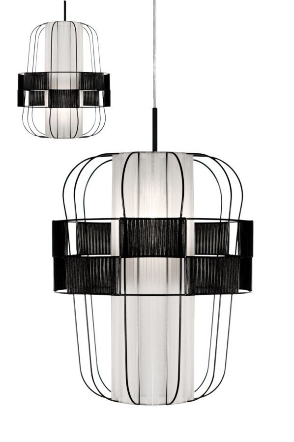 Kattovalaisin. Metallirungon ympärille kiedottua organzanauhaa. Voidaan ripustaa toisinkin päin helppo ripustusjärjestelmä. Halkaisija 40 cm. Korkeus 48 cm. Läpikuultava johto. Lampunkanta E27. Enintään 60 W. Design: Anna Andersson.