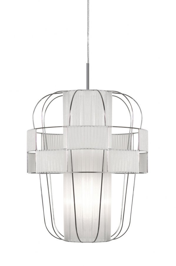 Kattovalaisin. Metallirungon ympärille kiedottua organzanauhaa. Voidaan ripustaa toisinkin päin helppo ripustusjärjestelmä. Halkaisija 40 cm. Korkeus 48 cm. Läpikuultava johto. Lampunkanta E27. Enintään 60 W. Design: Anna Andersson.
