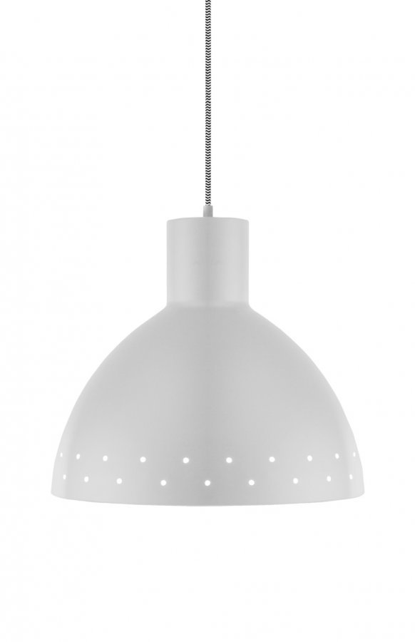 Kattovalaisin reikäkuvioista metallia. Pyöristetty reuna ja mustavalkoinen kangasjohto. Halkaisija 40 cm. Korkeus 38 cm. Kanta E27. Enintään 15 W:n energiansäästölamppu (60W). Suositellaan normaalia energiansäästölamppua. Design: Tess Palm.