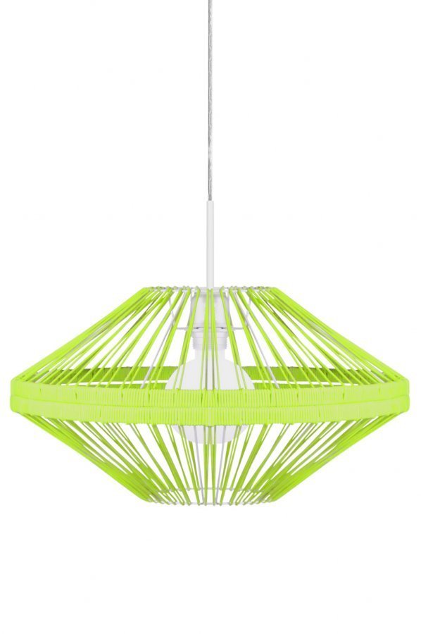 Kattovalaisin, jonka valkoiseksi maalatun metallirungon ympärille on kierretty pyöreää kuminauhaa. Läpikuultava johto sekä valkoiseksi maalattu putki ja laminointi. Halkaisija 45 cm, korkeus 24 cm. Lampunpidike E27, enintään 60 W. Hehkulamppu: E112 Opal Glob Halolux, himmennettävä.