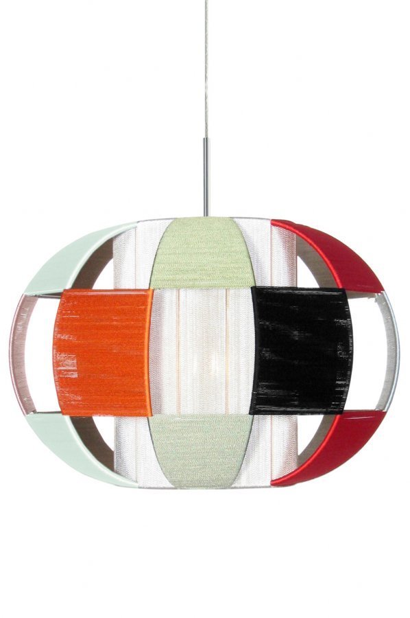 Kattovalaisin, jossa metallirungon ympärille kierrettyjä monivärisiä silkkilankoja. Läpikuultava johto. Ripustusputki krominväristä metallia. Halkaisija 55 cm, korkeus 36 cm. Iso kanta E27. Enintään 60 W. Lamppu ei ole mukana. Design: Anna Andersson.