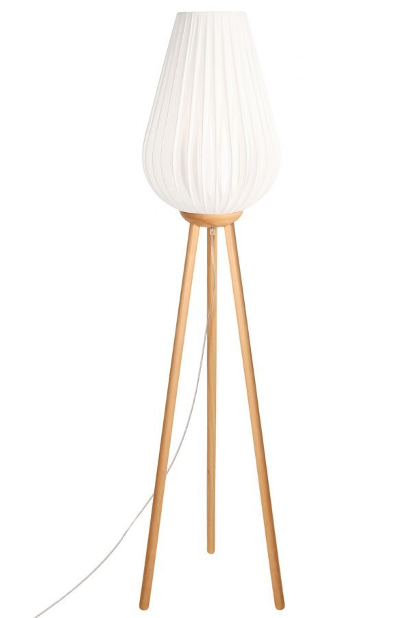 Lattiavalaisin öljyttyä sorvattua saarnia. Varjostin valkoista muovinauhaa. Läpikuultava johto ja lattiakatkaisin. Korkeus 140 cm, halkaisija 30 cm. Lampunpidike E27 Enintään 60 W.