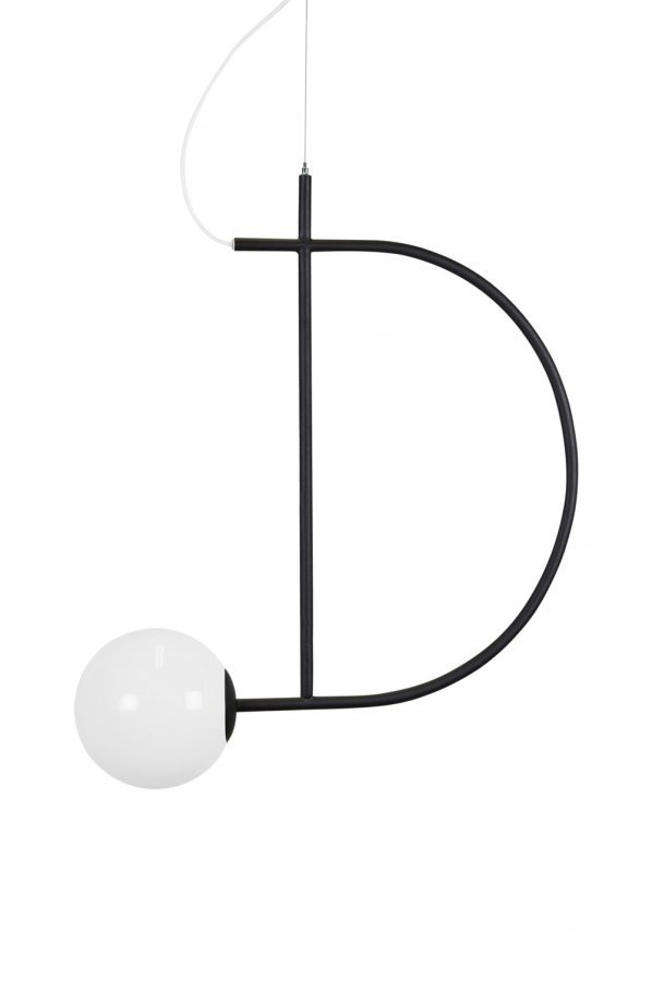 Kattovalaisin mustaksi maalattua metallia, valkoinen lasikupu. Valkoinen kangasjohto, jossa vaijeri. Korkeus 52 cm, leveys 58 cm, syvyys 20 cm. Lampunpidike E27, enintään 60 W.