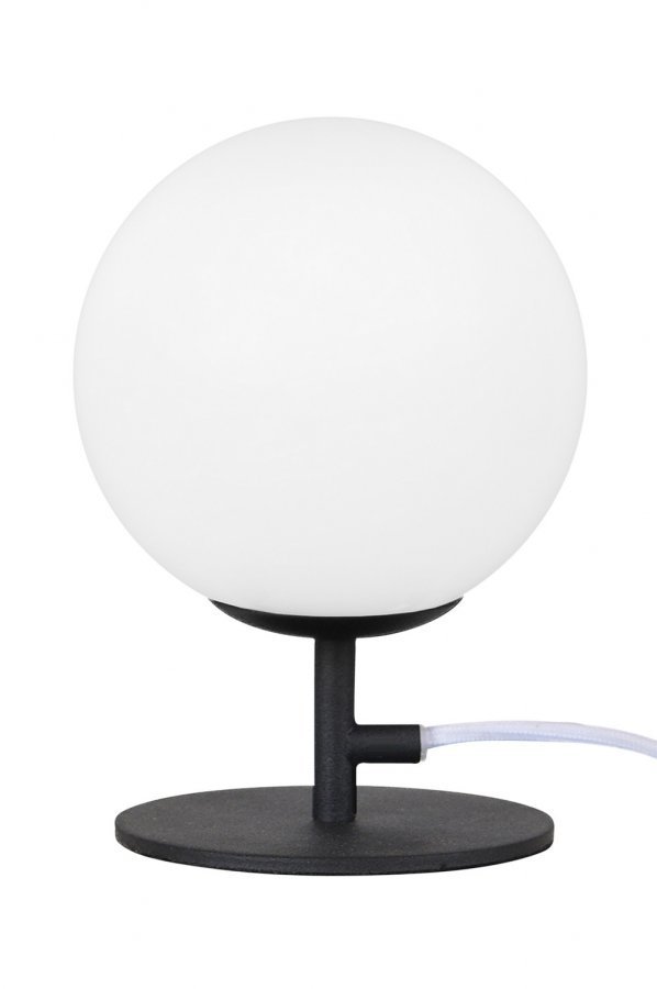 Pöytävalaisin jauhemaalattua mustaa metallia, valkoinen kupu duplex-lasia. Valkoinen kangasjohto, jossa katkaisin. Korkeus 18 cm, halkaisija 12 cm. Lampunpidike E14, enintään 40 W.