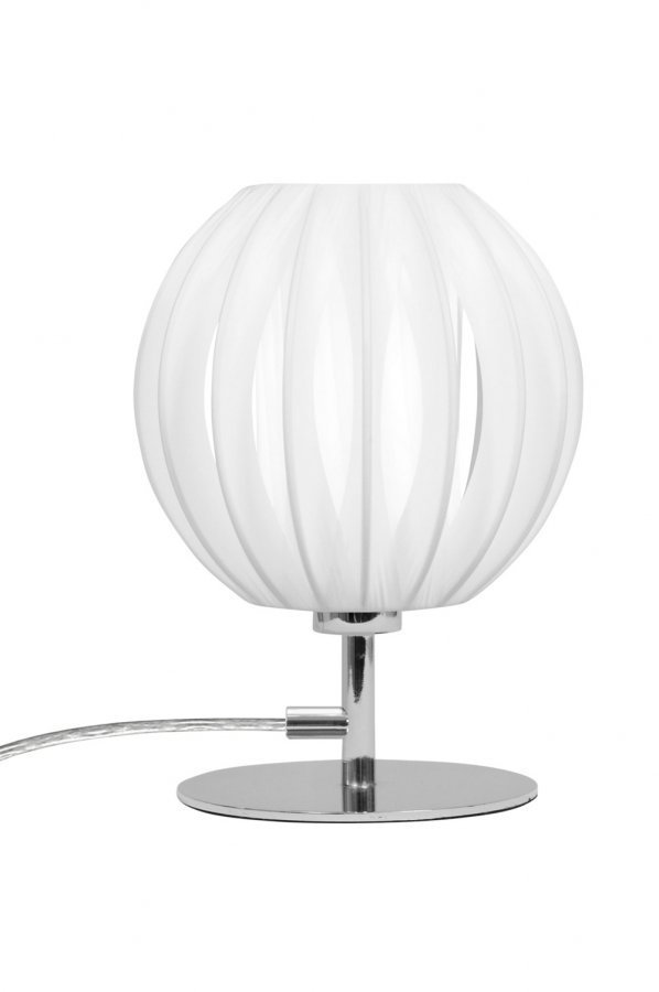Pöytävalaisin, jossa valkoista muovinauhaa metallirungon ympärillä. Jalka kromia. Halkaisija 15 cm, korkeus 20 cm. Lampunpidike E14, enintään 25 W.