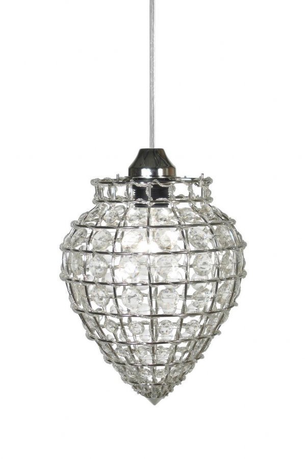 Mona-kattovalaisin krominväristä metallia. Kirkkaat akryyliprismat. Läpikuultava johto. Halkaisija 20 cm, korkeus 30 cm. Lampunkanta E27. Enintään 60 W. Design: Patrick Hall.