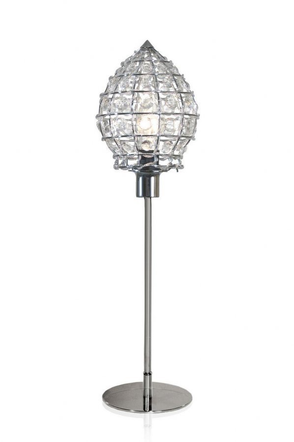 Mona-pöytävalaisin. Jalka ja kupu krominväristä metallia. Kirkkaat akryyliprismat. Läpikuultava johto, jossa katkaisin. Korkeus 46 cm, halkaisija 12 cm. Lampunkanta E14. Enintään 40 W. Design: Patrick Hall.