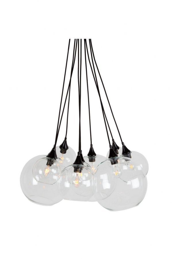 Pallas-kattovalaisin. Valaisimessa on 9 kirkasta riippuvaa lasikuulaa kolmessa koossa. Musta kangasjohto ja mattamustat metallisuojukset. 2-metrinen johto ja erityisen suuri kattokuppi. Korkeuden säätö on helppoa. Halkaisija 80 cm, korkeus 40 240 cm. Lampunpidike 3xE14 enintään 40, 6xE27 60 W. Design: Patrick Hall
