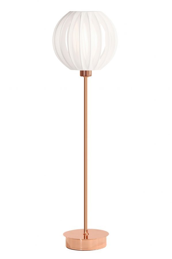 Pöytävalaisin, jossa valkoista muovinauhaa metallirungon ympärillä. Jalka metallia. Halkaisija 15 cm. Korkeus 51,5 cm. Lampunpidike: pieni lampunkanta E14, enintään 25 W. Hehkulamppu: L161 LED Kruunu. Suunnittelija: Anna Andersson