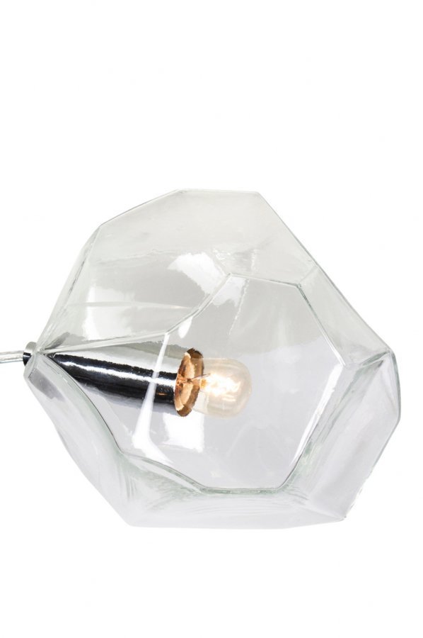 Rock-pöytävalaisin hiottua, kulmikasta lasia. Krominväriset detaljit. Läpikuultava johto, jossa katkaisin. Halkaisija 16 cm. Korkeus 18 cm. Lampunkanta E14. Enintään 40 W. Design: Tess Palm.