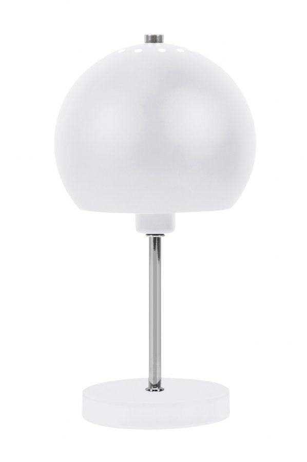 Pöytävalaisin mattavalkoista metallia, jossa kaunis reikäkuvio yläpuolella ja krominväriset detaljit. Läpikuultava johto, jossa katkaisin. Halkaisija 14 cm, korkeus 28 cm. Lampunpidike E14, enintään 40 W.