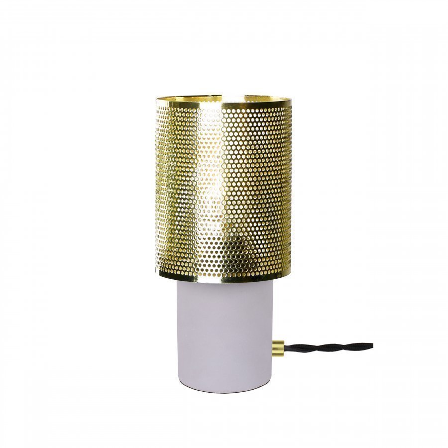Rumble pöytävalaisin Globen Lighting -tuotemerkiltä. Valmistettu betonista, perforoitu varjostin messinkiä. Hienot mustat yksityiskohdat ja kierretty tekstiilijohto 2 m. Katkaisin ja seinäpistoke. Kanta E14, max 40 W.