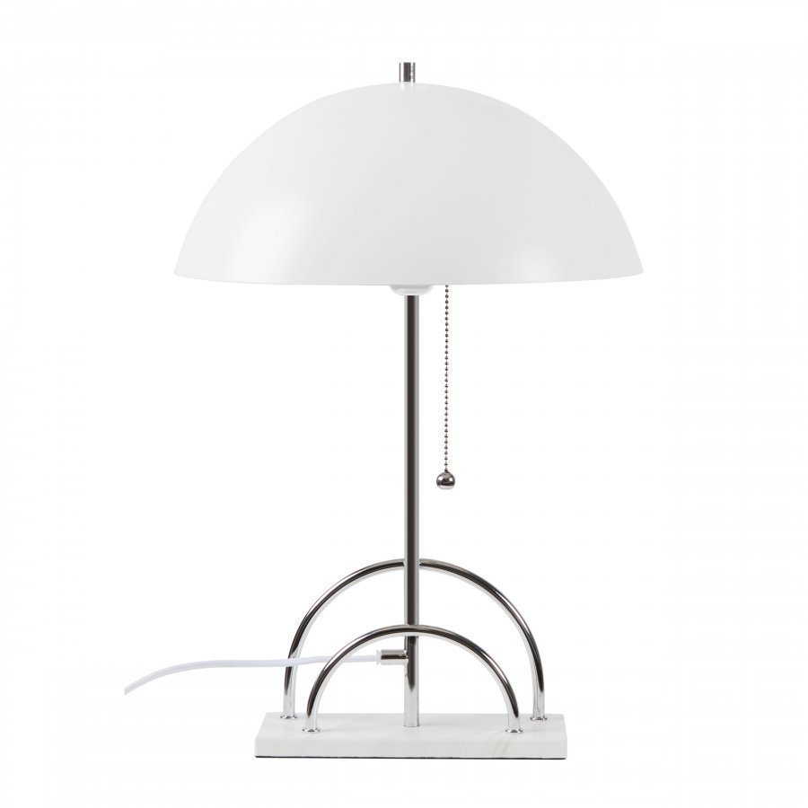 Globen Lightingin pöytävalaisin, jossa on tyylikkäitä yksityiskohtia, jotka toimivat säilytysratkaisuina. Valaisin sytytetään ja sammutetaan vedettävästä katkaisijasta ja se seisoo marmorisella tarjottimella. Tekstiilijohto.