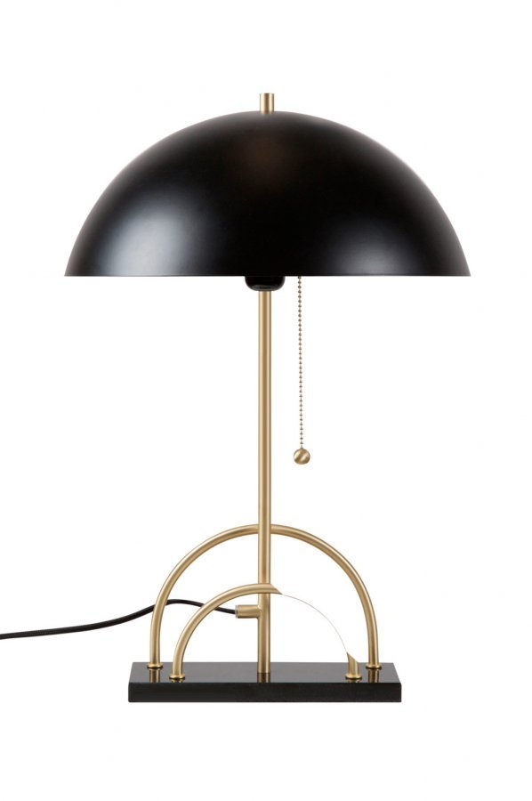 Pöytävalaisin, jossa kromattu metallirunko. Kätevä teline kirjeille tai kuville. Varjostin mustaksi maalattua metallia ja jalka mustaa marmoria. Musta kangasjohto. Vetokatkaisin kromia. Korkeus 50 cm, halkaisija 34 cm. Lampunpidike E27, enintään 60 W.