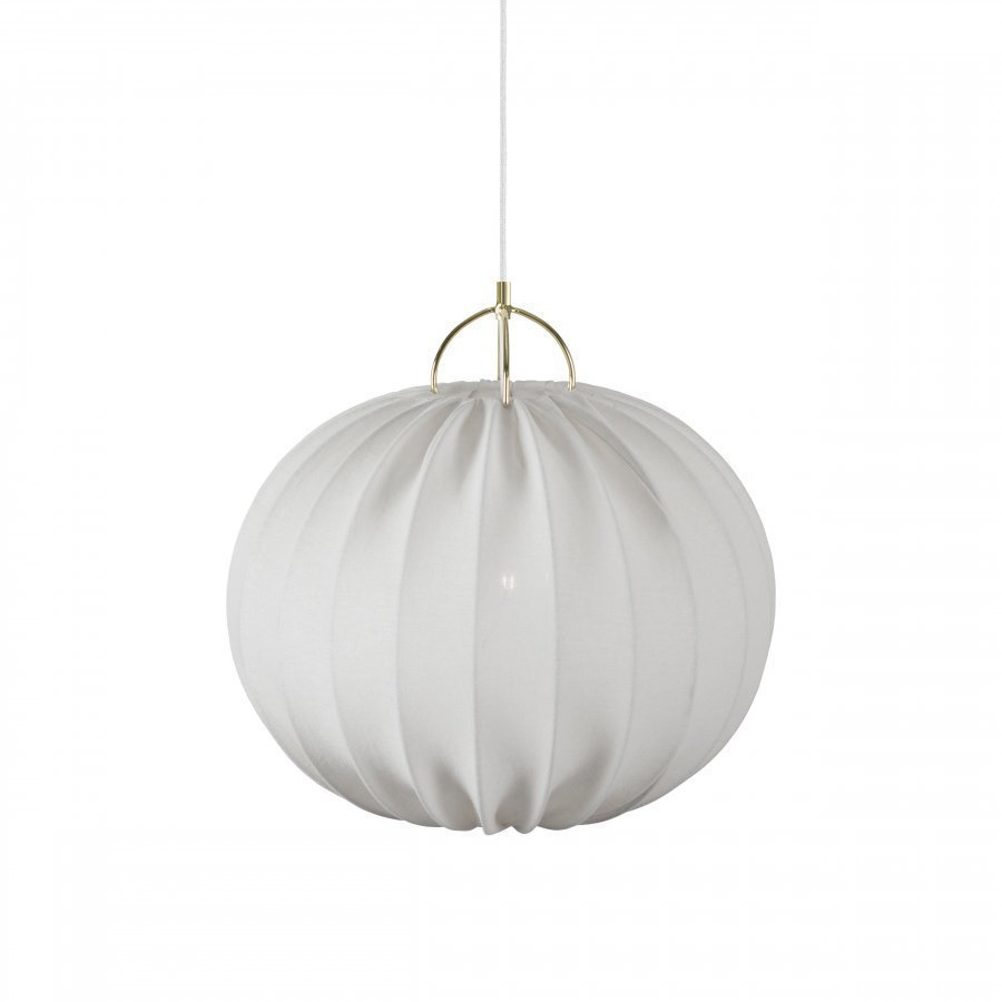 Globen Lightingin kattovalaisin. Lampunvarjostin, joka on ylellistä pellavaa, roikkuu metallisesta kiinnikkeessä. Valkoinen tekstiilijohto ja kattokupu.